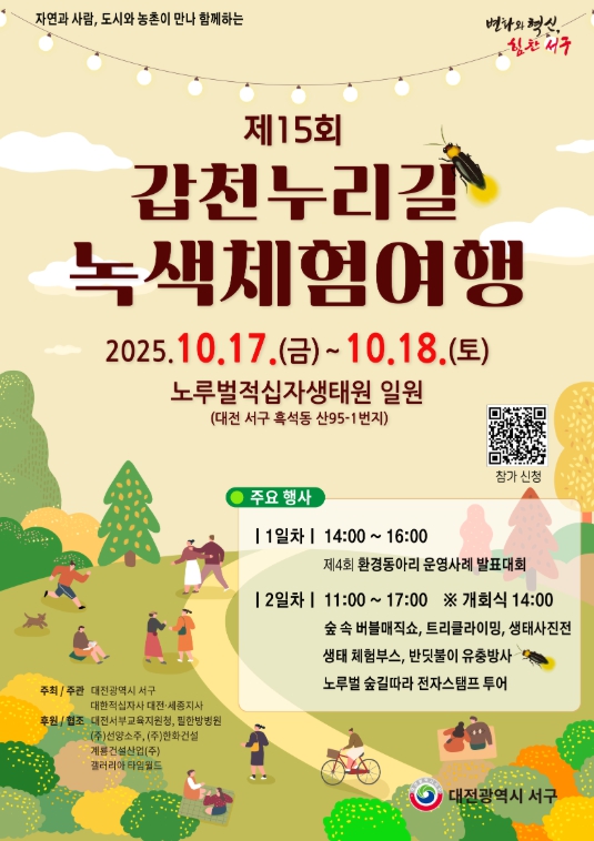 [뉴스스텝] 대전 서구는 이달 17일부터 18일까지 노루벌 적십자생태원에서 자연과 환경을 사랑하는 시민들을 위한 ‘제15회 갑천누리길 녹색체험여행’을 대한적십자사 대전·세종지사와 공동으로 개최한다.