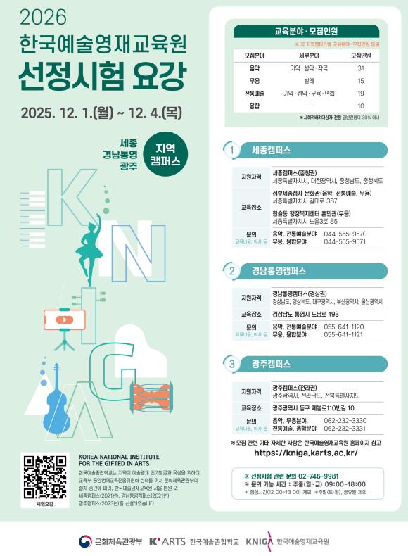 [뉴스스텝] 한국예술종합학교 부설 한국예술영재교육원 세종캠퍼스가 내달 1일부터 4일까지 2026학년도 교육생을 모집한다.