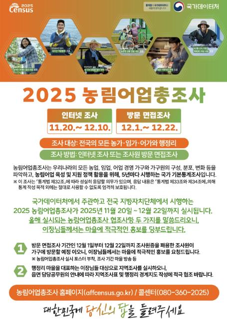 [뉴스스텝] 예천군은 12월 1일부터 22일까지 인터넷 참여가 어려운 가구를 대상으로 ‘2025 농림어업총조사’를 방문하여 실시한다.