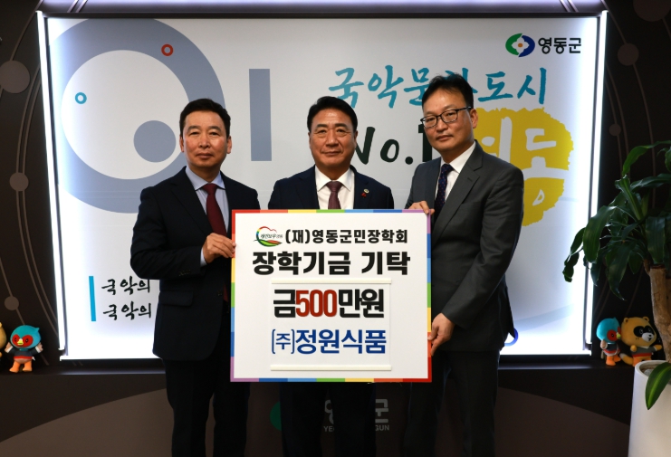 [뉴스스텝] ㈜정원식품(대표 김훈섭)은 16일 오후 영동군청을 방문해 지역 미래 인재를 육성하기 위한 장학금 500만 원을 (재)영동군민장학회에 기탁했다.