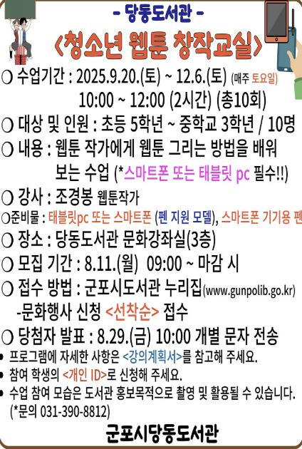 [뉴스스텝] 군포시 당동도서관은 청소년을 대상으로 9월 20일부터 12월 6일까지 매주 토요일 10~12시, 총 10회에 걸쳐 '청소년 웹툰 창작교실'을 운영한다.