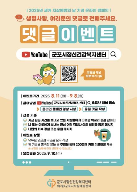 [뉴스스텝] 군포시정신건강복지센터(부설 자살예방센터)는 세계 자살예방의 날(9월 10일)을 맞아 2025년 8월 11일부터 9월 8일까지 약 한 달간 온라인 캠페인 ‘생명사랑, 여러분의 댓글로 전해주세요’를 운영한다고 밝혔다.