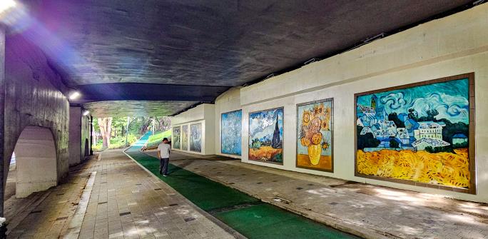 이번 사업은 강남둘레길 재정비와 연계해 양재천의 가치를 높이고, 시민들에게 쾌적하면서도 매력적인 공간을 제공하기 위해 추진됐다. 높이 4.9m, 길이 41.7m 규모의 교각 하부 보행통로 벽면에 ‘론강의 별이 빛나는 밤’, ‘밤의 카페 테라스’, ‘해바라기’ 등 고흐의 대표작 7점이 벽화로 재현됐다. 단순한 장식이 아니라, 페인트와 타일을 결합한 방식으로 내구성과 예술성을 동시에 살렸다.