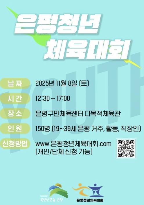 참여자는 내달 5일까지 선착순 150명 모집할 예정이며, 은평구에 거주하거나 활동하는 청년이라면 누구나 신청할 수 있다. 신청 하려면 은평청년 체육대회 누리집을 참고하거나 포스터 큐알(QR)코드를 통해 온라인 신청서를 제출하면 된다.