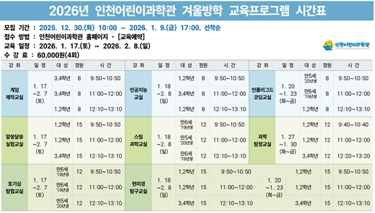 [뉴스스텝] 인천시설공단 인천어린이과학관은 겨울방학을 맞이해 어린이들의 과학적 탐구 능력을 증진할 수 있는 '2026년 겨울방학 교육프로그램'을 내달 17일부터 2월 8일까지 운영한다.