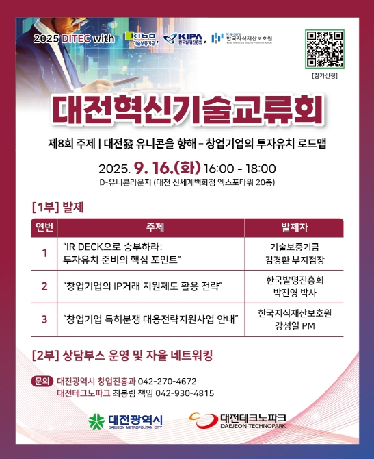 [뉴스스텝] 대전시는 9월 16일 대전신세계 엑스포타워 20층 유니콘라운지에서 ‘제8회 대전혁신기술교류회(DITEC)’를 열고, 기술보증기금·한국발명진흥회·한국지식재산보호원 등 혁신기술 지원기관과 함께 창업기업의 투자유치 전략부터 지식재산 거래·보호, 특허·상표 분쟁 대응까지 실무 중심 지원 정보를 제공한다.