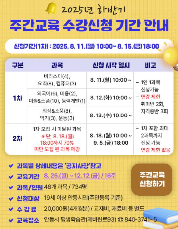 이번 교육은 8월 25일부터 12월 12일까지 16주간 운영되며, 총 48개 과목에서 734명의 수강생을 모집할 예정이다. 안동시에 주소를 둔 만 19세 이상 시민이라면 누구나 신청 가능하다.