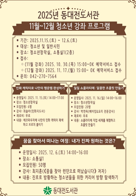 [뉴스스텝] 동대전도서관은 11월 15일부터 12월 6일까지 청소년을 대상으로 ‘청소년, 나를 발견하고 꿈을 그리다’를 주제로 한 문화예술·진로 강좌를 운영한다.