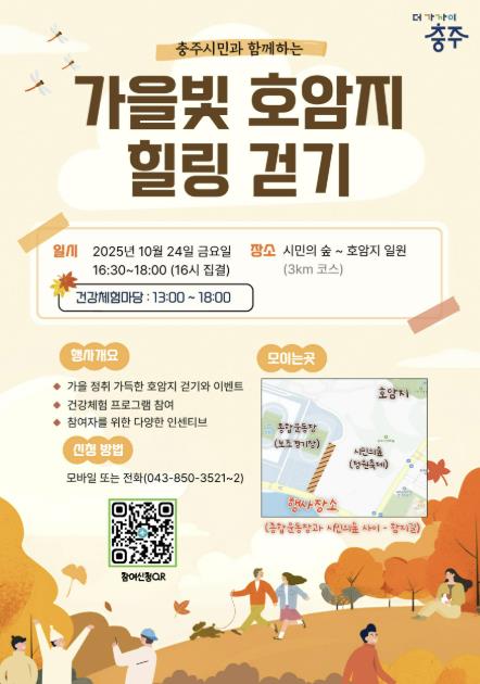 정상구 충주시보건소장은 “호암지는 충주시민이 가장 사랑하는 산책 명소로, 가을빛 풍경 속에서 건강과 즐거움을 동시에 느낄 수 있는 소중한 시간이 될 것”이라며 “많은 시민들이 가족, 이웃과 함께 참여해 일상 속 건강한 변화를 경험하시길 바란다”고 전했다.