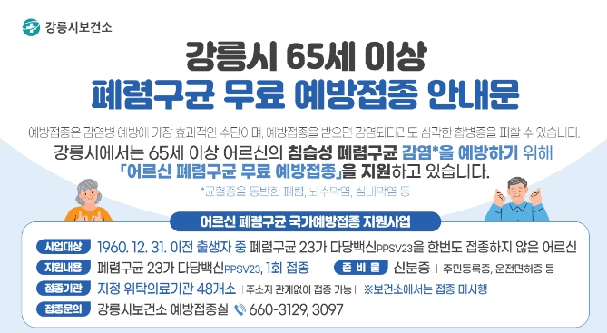 [뉴스스텝] 강릉시는 기온이 급격히 떨어지는 겨울철을 앞두고 면역력이 저하된 65세 이상 어르신들의 폐렴구균 예방접종률이 저조함에 따라, 중증 감염병 예방을 위한 시민들의 적극적인 접종 참여를 당부했다.