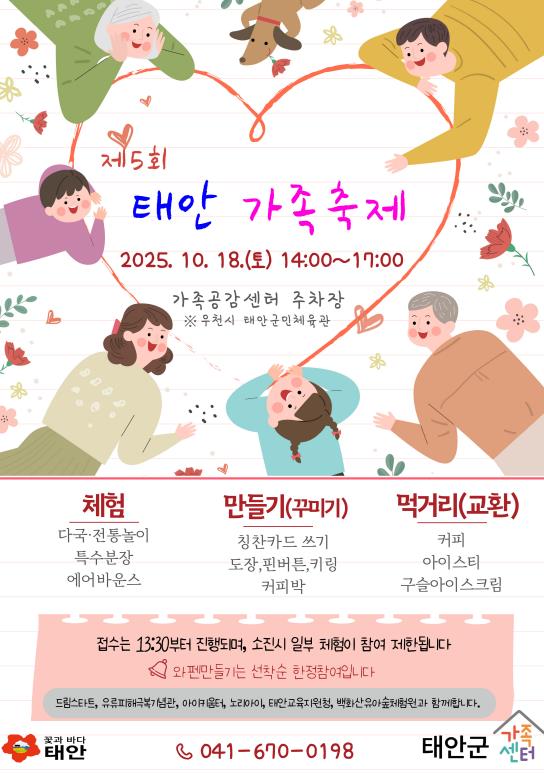군 관계자는 “태안에 정착한 다양한 가족들의 삶을 함께 살피고 군민 모두가 밝게 웃는 태안을 조성하고자 이번 축제를 개최하게 됐다”며 “군민 누구나 즐길 수 있는 이번 축제에 많은 분들이 오셔서 가족과 함께 하는 가을의 행복을 만끽하시길 바란다”고 말했다.