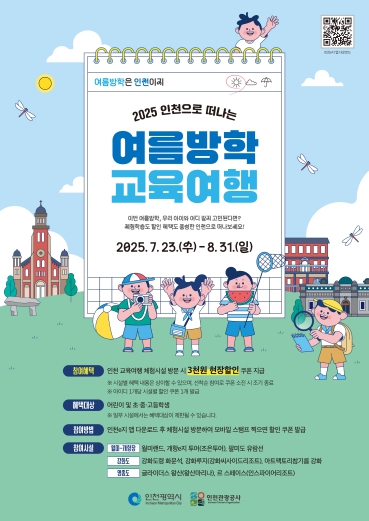 [뉴스스텝] 인천광역시와 인천관광공사는 여름방학을 맞아 청소년들이 다양한 체험을 통해 즐겁게 배우고 성장할 수 있도록 인천의 대표 교육여행 체험시설 8곳에서 할인 혜택을 제공하는 “2025 인천으로 떠나는 여름방학 교육여행” 이벤트를 진행한다고 밝혔다.