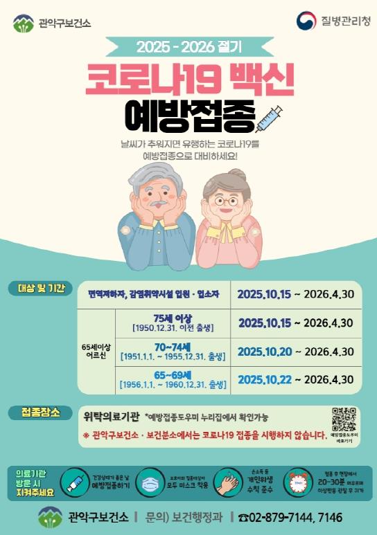 구는 오는 15일부터 호흡기 질환 고위험군인 ▲65세 이상 어르신 ▲면역저하자 ▲감염취약시설 입원‧입소자 등을 대상으로 코로나19 백신 무료 접종을 시행할 예정이다.