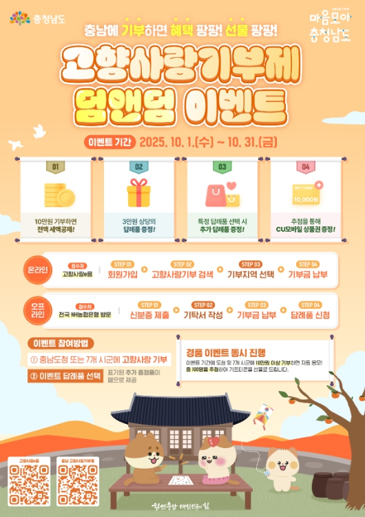 [뉴스스텝] 충남도는 천안·공주·보령·금산·서천·청양·예산 7개 시군과 10월 한 달간 ‘추석맞이 고향사랑 덤앤덤 이벤트’를 실시한다고 29일 밝혔다.
