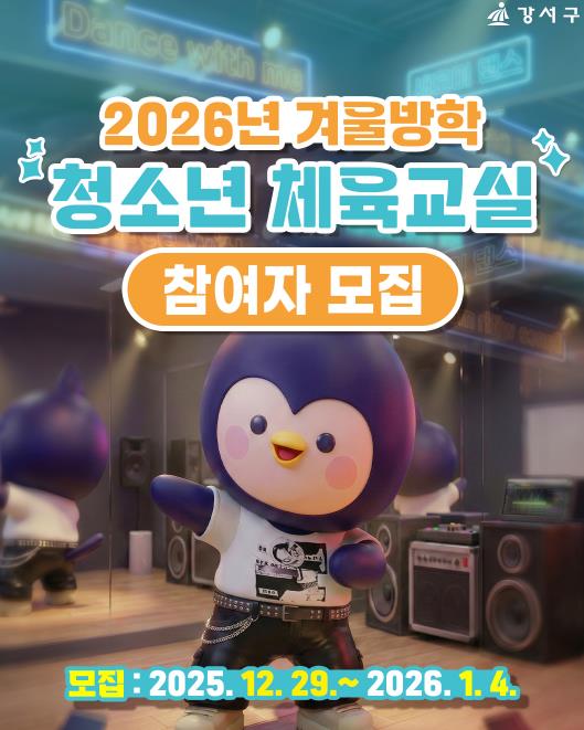 모집 인원은 관내 초·중·고등학생 135명으로, 신청은 오는 12월 29일(월) 오전 9시부터 2026년 1월 4일(일) 오후 6시까지 강서구 공공체육시설 누리집를 통해 온라인으로 가능하다.