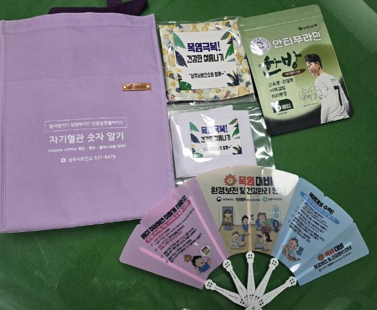 이에 상주시보건소는 건강취약계층을 대상으로 방문건강관리 전문인력이 직접 방문하여 보냉가방, 부채, 쿨토시, 손수건 등을 지원한다.