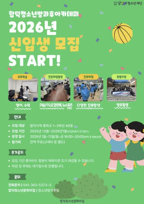 합덕청소년방과후아카데미 관계자는 “단순 돌봄을 넘어 청소년의 학습, 진로, 인성을 종합적으로 지원하는 질 높은 프로그램을 운영하겠다”며 “매년 조기 마감 사례가 있는 만큼 관심 있는 가정의 빠른 문의를 바란다”고 전했다.