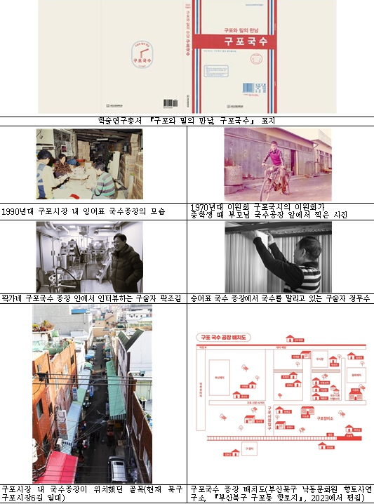 사진 자료에는 문헌자료, 국수 생산 장면, 구포시장 풍경 등을 수록하여 글자(텍스트)와 현장의 이미지를 함께 확인할 수 있도록 구성했다.