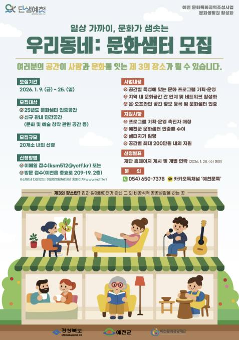 [뉴스스텝] 예천군과 (재)예천문화관광재단은 ‘문화특화지역 조성사업’의 일환으로 문화생활권 조성을 위한 ‘우리동네:문화샘터’ 2기 참여자를 9일부터 25일까지 모집한다.