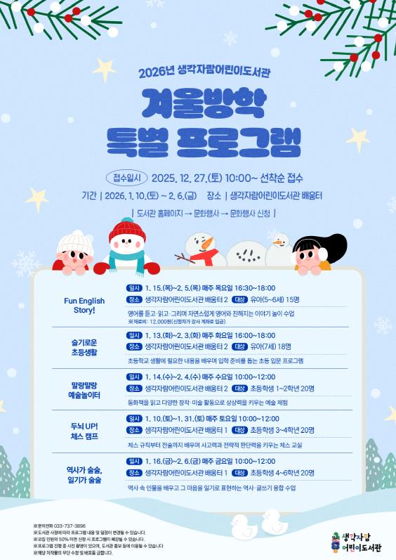 [뉴스스텝] 원주시 생각자람어린이도서관은 유아부터 초등학생을 대상으로 ‘겨울방학 특별 프로그램’을 운영한다.