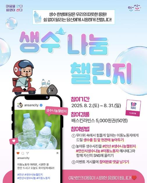 참여 방법은 간단하다. 시민 누구나 무더위 속에서 일하는 이동노동자들을 위해 현관 앞에 시원한 생수를 놓아두고, 그 사진을 개인 사회관계망서비스(SNS)에 필수 해시태그와 함께 게시하면 된다. 필수 해시태그는 #안산 #생수나눔챌린지 #안산시생수나눔 #이동노동자 등이다. 챌린지 참여자 가운데 추첨을 통해 50명에게는 아이스크림(베스킨라빈스) 모바일 상품권이 제공된다.