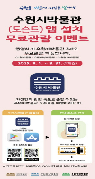 [뉴스스텝] 수원시박물관은 8월 31일까지 ‘수원시박물관’ 앱을 설치하면 수원·수원화성·수원광교박물관 무료 관람로 관람할 수 있는 이벤트를 연다.