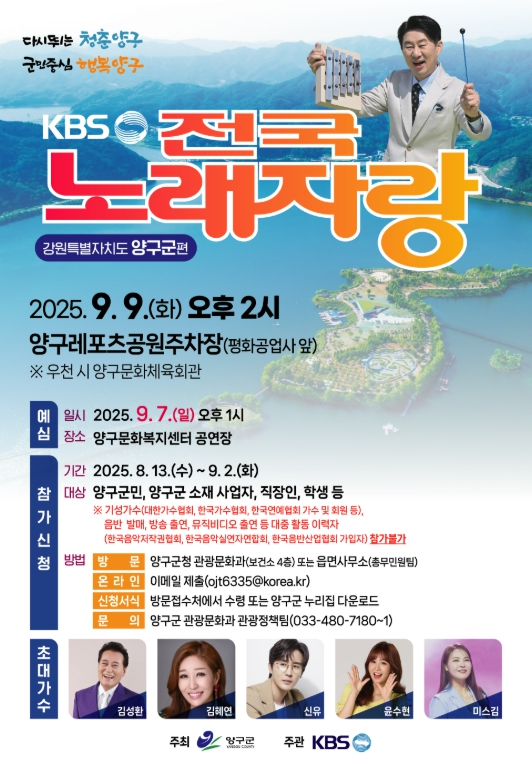 [뉴스스텝] 양구군은 국민 프로그램으로 사랑받는 KBS 1TV ‘전국노래자랑’이 오는 9월 9일 양구읍 서천변 레포츠공원 주차장에서 양구 편 녹화를 진행한다고 밝혔다.
