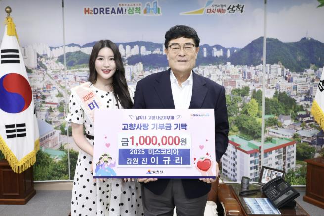 [뉴스스텝] 2025 미스코리아 미스강원 진 이규리(21, 중앙대학교 연극영화과)는 14일 삼척시청을 방문하여 고향사랑기부금 100만 원을 전달했다.