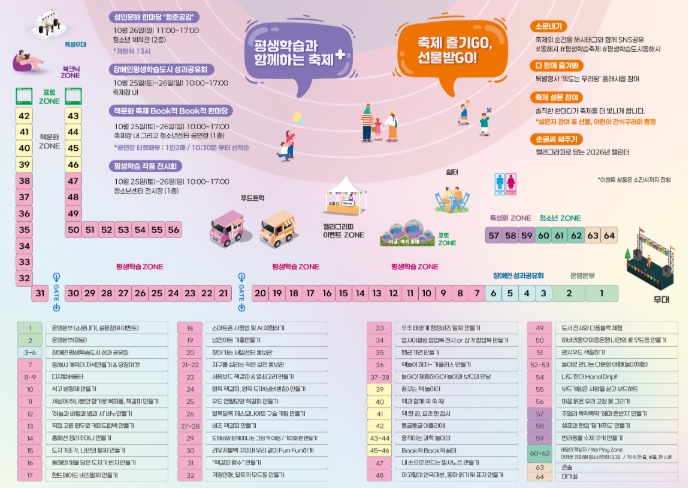 세대와 계층을 잇는 소통의 공간 조성을 위해 지역의 100여개 평생학습관련 기관·단체·동아리, 학습자 등이 참여하여 평생학습마당·BOOK적BOOK적한마당·장애인 평생학습한마당·문해교육 한마당 등 테마별로 나누어 공연발표(40여개), 체험·홍보존(50여개) 및 전시존을 운영하며, 어린이를 위한 뮤지컬, 마술극 등 다양한 프로그램도 진행된다.