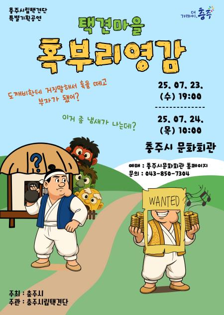 [뉴스스텝] 충주시가 주최하고 충주시립택견원이 주관하는 특별기획공연 ‘택견마을 혹부리 영감’이 충주시문화회관에서 23일(오후 7시)과 24일(오전 1시) 이틀간 전석 무료로 개최된다.