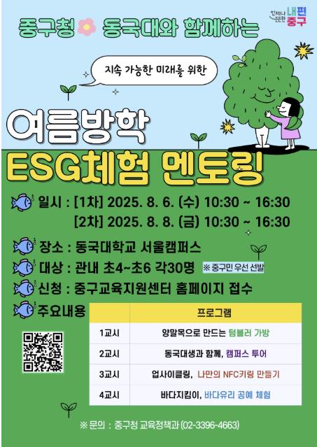[뉴스스텝] 서울 중구가 여름방학 중인 초등학생들을 위해 동국대학교와 함께 ‘원데이 ESG 체험 멘토링’을 운영한다.