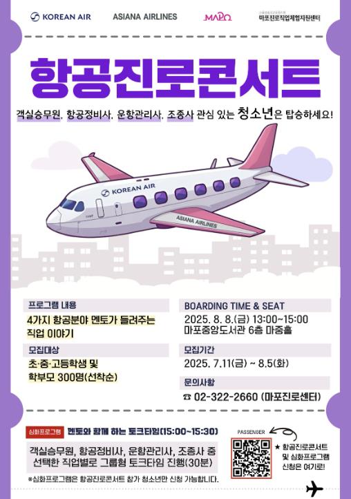 [뉴스스텝] 마포구는 청소년들에게 항공 분야에 대한 생생한 진로 정보를 제공하기 위해 8월 8일 오후 1시, 마포중앙도서관 6층 마중홀에서 ‘2025 항공진로콘서트’를 개최한다.