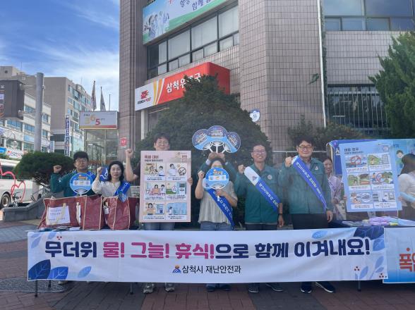 이번 캠페인에는 삼척시 재난안전과와 보건소 직원 등 20여 명이 참여하여, 폭염으로 인한 온열질환 예방 수칙을 비롯해 태풍·호우 시 국민행동요령, 식중독 및 비브리오패혈증 예방법 등을 집중 홍보했다.