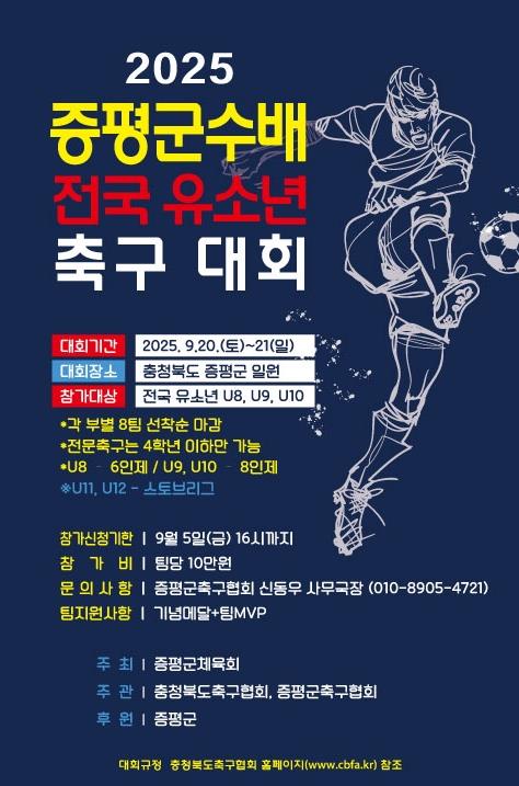 [뉴스스텝] 충북 증평군은 오는 19일부터 21일까지 증평종합운동장, 증평대교 잔디구장, 증평풋살경기장 등 3개 구장에서 ‘2025년 증평군수배 유소년축구대회’를 개최한다고 밝혔다.