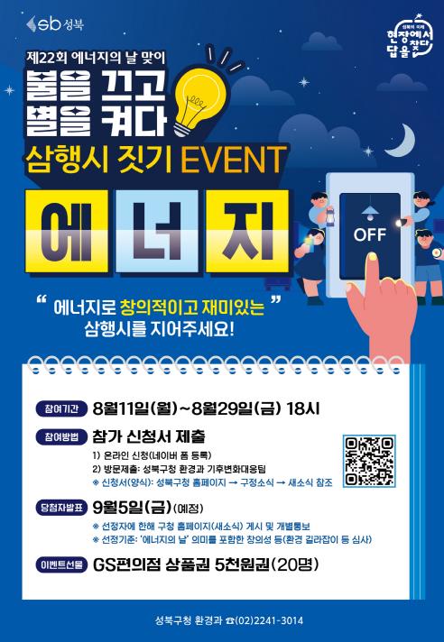 ‘에너지 삼행시 짓기’ 이벤트는 8월 11일부터 8월 29일까지 접수를 받는다. 참여를 원하는 구민은 네이버폼을 통해 신청하거나, 성북구청 홈페이지에서 신청서를 내려받아 직접 방문해 접수할 수 있다. 접수된 삼행시는 ‘환경 길라잡이’ 심사를 거쳐 최종 20명을 선정, GS편의점 5천원 상품권이 부상으로 지급된다.