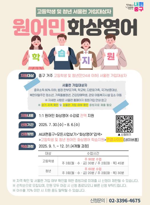 이번 사업은 중구가 서울시의 ‘2025 원어민 화상영어 시범사업 공모’에 선정돼 추진하게 됐다. 구는 이를 통해 교육 소외계층의 학습 격차를 줄이고, 글로벌 역량을 갖춘 인재로 성장할 수 있도록 적극 지원할 계획이다.