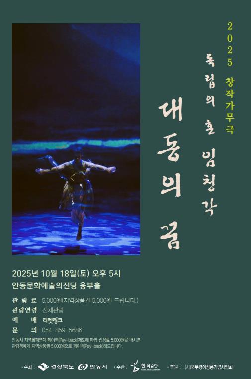 [뉴스스텝] 한예술단이 주최․주관하는 '2025 창작가무극 독립의 혼 임청각 ‘대동의 꿈’' 공연이 10월 18일 오후 5시, 안동문화예술의전당 웅부홀에서 개최된다.
