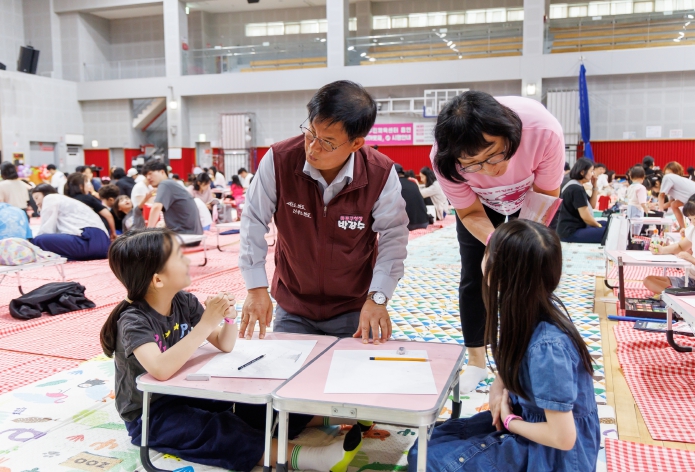 ▲ 박강수 마포구청장이 그림 그리기 대회에 참석한 어린이와 인사하고 있다.