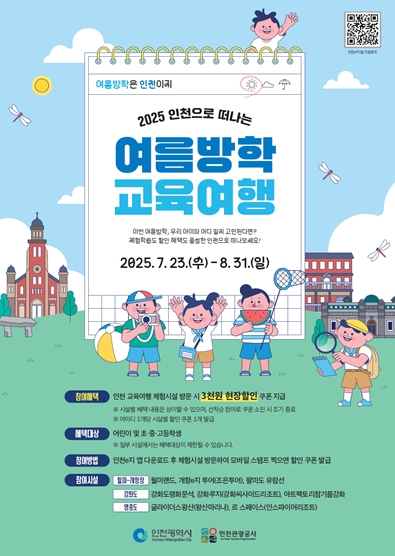 [뉴스스텝] 인천광역시와 인천관광공사는 여름방학을 맞아 7월 23일부터 8월 31일까지 청소년을 대상으로 ‘2025 인천으로 떠나는 여름방학 교육여행’ 이벤트를 진행한다고 밝혔다.