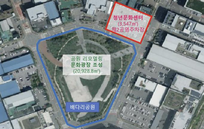 주차전용건축물에는 청년문화센터(지상 1~2층, 3500㎡)와 주차장(지상 2~5층·옥상, 1만1500㎡, 430면)을 조성하고, 배다리공원(2만929㎡)은 열린문화광장으로 리모델링한다.2029년 10월 완공을 목표로 2026년 10월 착공할 예정이다.