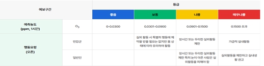 ▲ 오존 예보등급 및 행동요령(출처: 에어코리아) |