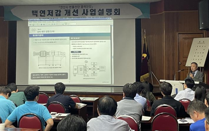 [뉴스스텝] 안산시는 지난 15일 반월패션칼라사업협동조합 대강당에서 ‘반월산단 염색단지 백연저감 개선 사업설명회’를 개최했다고 17일 밝혔다.