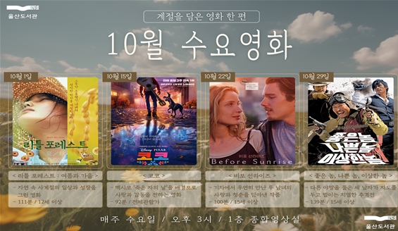 [뉴스스텝] 울산도서관이 10월 한 달간 매주 수요일 오후 3시 도서관 1층 종합영상실에서 ‘계절을 담은 영화 한 편’을 주제로 영화를 상영한다.