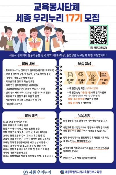 [뉴스스텝] 세종특별자치시교육청진로교육원과 협력하여 진로·진학 멘토링을 운영하는 ‘세종우리누리’가 ‘제17기 멘토 및 임원진’을 모집한다.