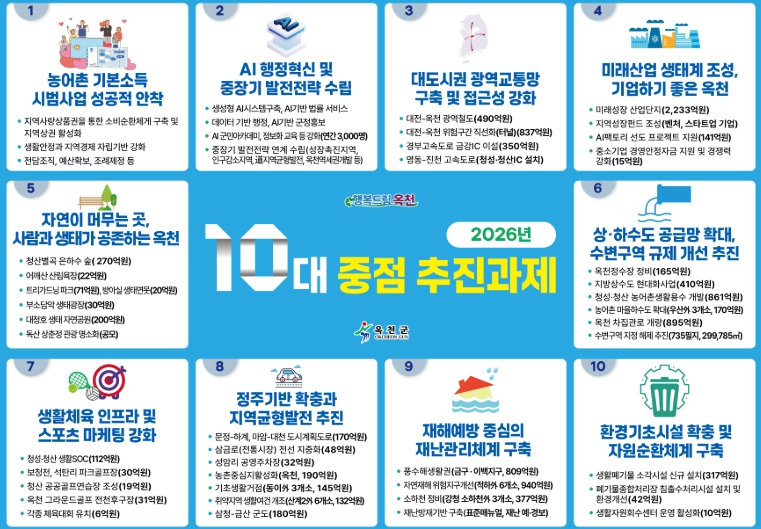 [뉴스스텝] 옥천군이 26일 2026년 군정 운영의 핵심 방향을 담은 10대 중점 추진과제를 발표하고, 군민 삶의 질 향상과 지속가능한 지역성장을 위한 정책 추진에 나선다.