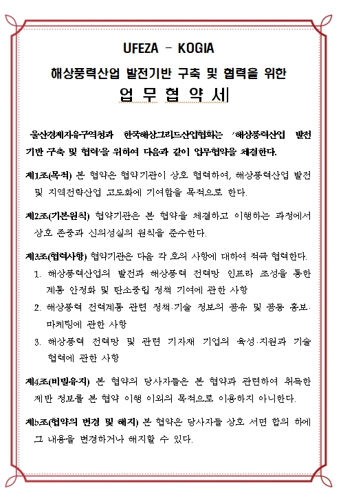 울산경제자유구역청은 17일 오후 2시 울산전시컨벤션센터(유에코·UECO)에서 한국해상그리드산업협회와 해상풍력산업 발전 기반 구축과 협력을 위한 업무협약(MOU)을 체결한다고 밝혔다.