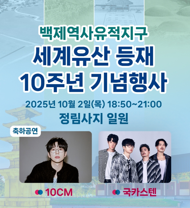공식 행사로는 세계유산 등재 10주년 축하 퍼포먼스와 정림사지 오층 석탑의 아름다움을 한껏 느낄 수 있는 미디어아트 공연이 펼쳐지고, 이후 인기가수인 10CM와 국카스텐의 축하공연이 이어져 가을밤을 뜨겁게 달굴 예정이다.