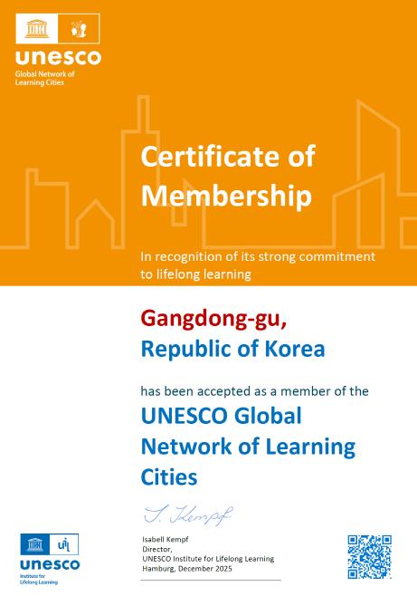 [뉴스스텝] 서울 강동구는 지난 5일, 유네스코 글로벌 학습도시(GNLC: Global Network of Learning Cities)로 최종 선정되며 우수한 평생교육 인프라와 정책을 국제적으로 인정받았다고 밝혔다.