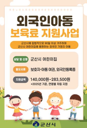 지원 대상은 군산시에 90일 이상 합법적으로 체류하고 있으면서 관내 어린이집에 재원하는 아동으로, 매월 내국인 아동 기본 보육료 단가의 50%를 지원한다.