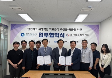 [뉴스스텝] 인천광역시는 성장기 학생들에게 안전하고 우수한 품질의 축산물을 안정적으로 공급하기 위해 2025년도 학교급식 축산물 공급업체 선정을 완료하고, 지난 7월 4일 축산물품질평가원 서울지원(서울지원)과 업무협약을 체결했다고 밝혔다.